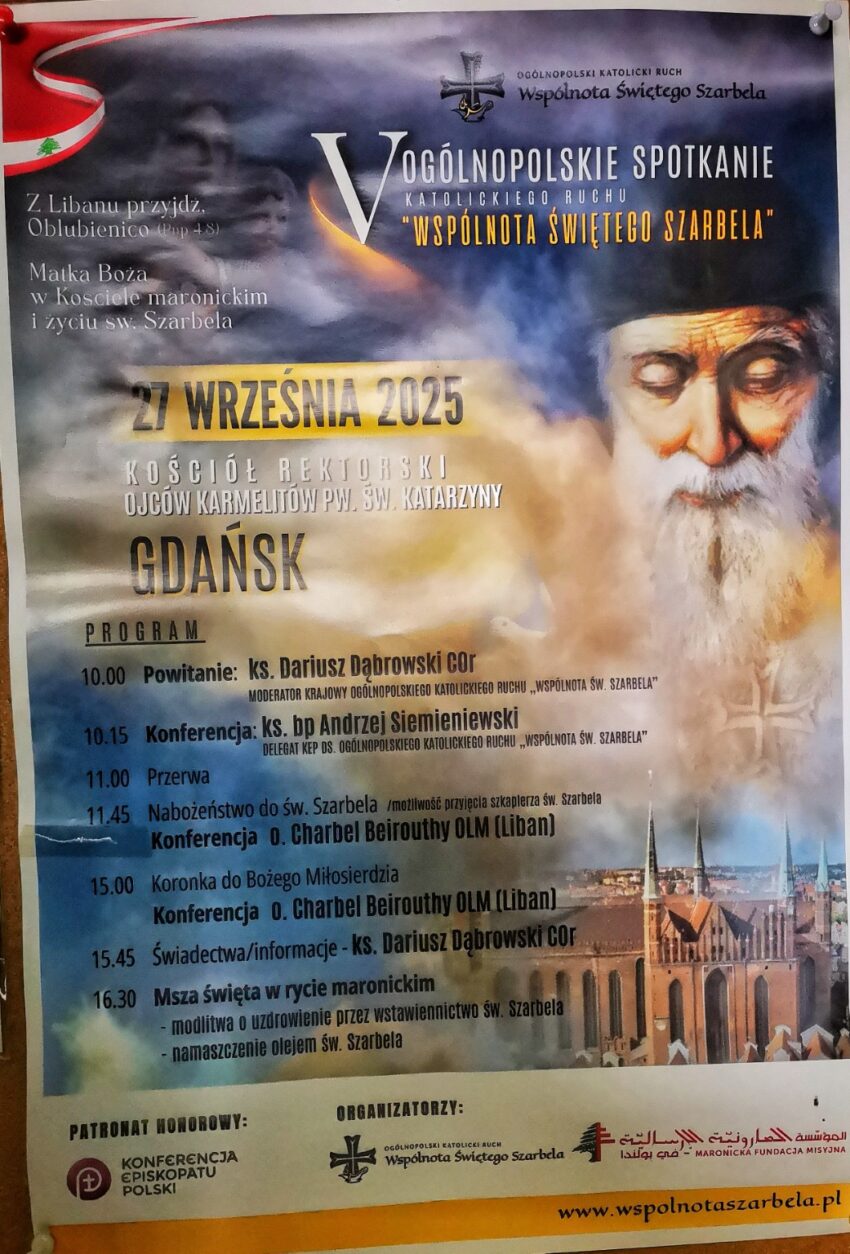 Z wielką radością zapraszamy wszystkich wiernych, czcicieli św. Szarbela, miłośników duchowości maronickiej oraz osoby poszukujące głębszej więzi z Bogiem na V Ogólnopolskie Spotkanie Katolickiego Ruchu „Wspólnota Świętego Szarbela”, które odbędzie się 27 września 2025 roku w Gdańsku. Miejscem wydarzenia będzie Kościół Rektorski Ojców Karmelitów pw. św. Katarzyny, w samym sercu Trójmiasta. Tegoroczny temat spotkania brzmi:„Z…